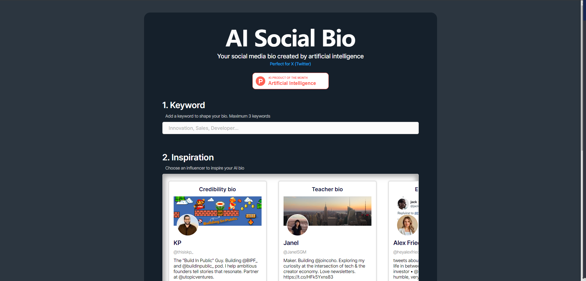 1. Customization with Keywords: Users can input up to three keywords that best describe them or their brand, allowing the AI to craft a bio that aligns with their personal or professional identity.