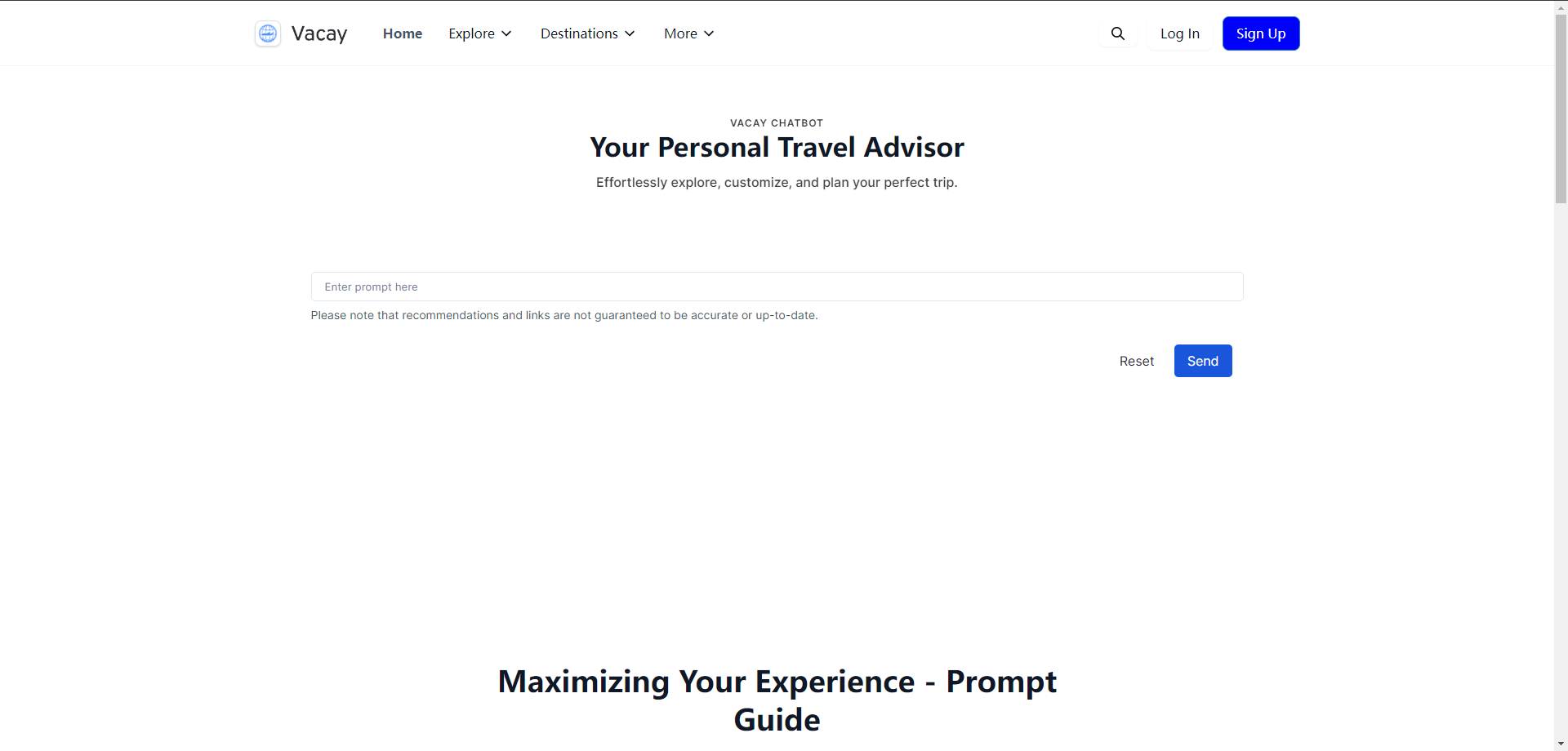Vacay Chatbot is an "AI-powered travel planning platform offering personalized travel recommendations and itinerary building, catering to diverse travel styles and preferences."