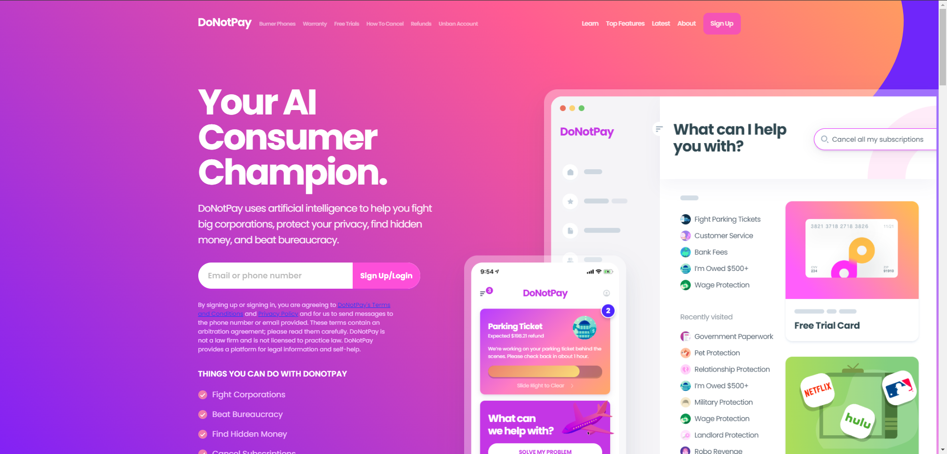 DoNotPay's range of services is broad and multifaceted. It helps users in various legal scenarios, such as contesting parking tickets, appealing bank fees, and combating robocallers. The platform simplifies these processes by providing users with the necessary tools to take action against large corporations, protect their privacy, and uncover hidden funds. Moreover, it assists in canceling subscriptions and automatically managing free trials, thus saving users from unwanted charges and fees.