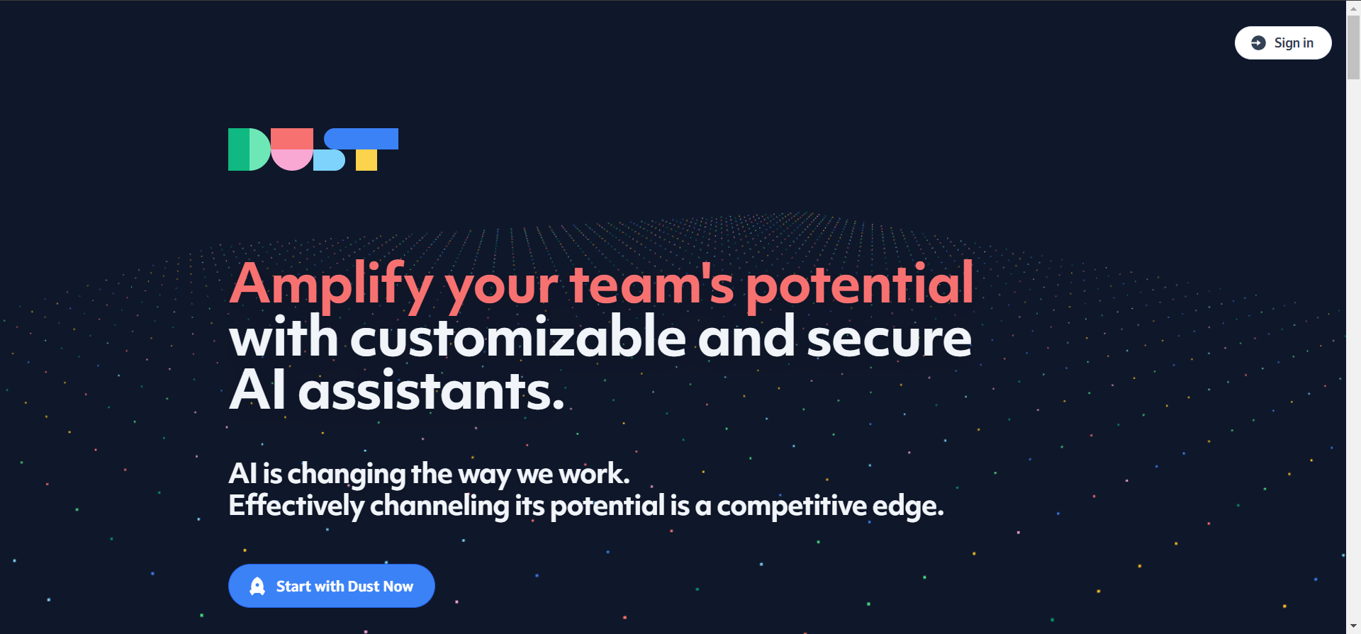Dust.ttは、カスタマイズ可能で安全なAIアシスタントを通じてチームの潜在能力を高めるために設計された革新的なプラットフォームです。これは、AIを利用してワークフローを合理化し効率を向上させることで、仕事のアプローチ方法において顕著な変化を示しています。