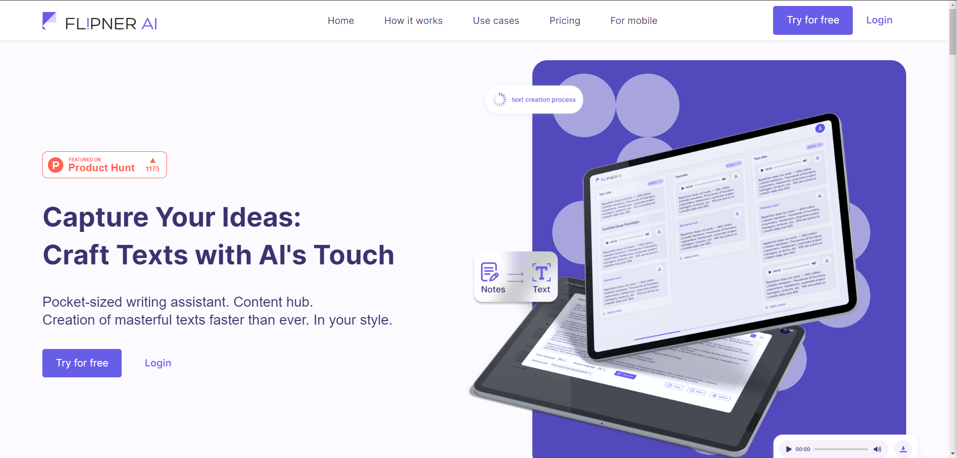 The tool boasts a range of features designed to cater to the diverse needs of its users. From capturing ideas on the go and storing them in a content hub to transforming these scattered thoughts into polished texts with a simple click, Flipner AI is as versatile as it is innovative. Users can choose from over ten text styles, edit and rewrite drafts, and even produce content in more than 30 languages, making it a truly global tool. The emphasis on combining human creativity with AI efficiency marks Flipner as a unique player in the AI writing space, offering a solution that is both practical and inspiring.