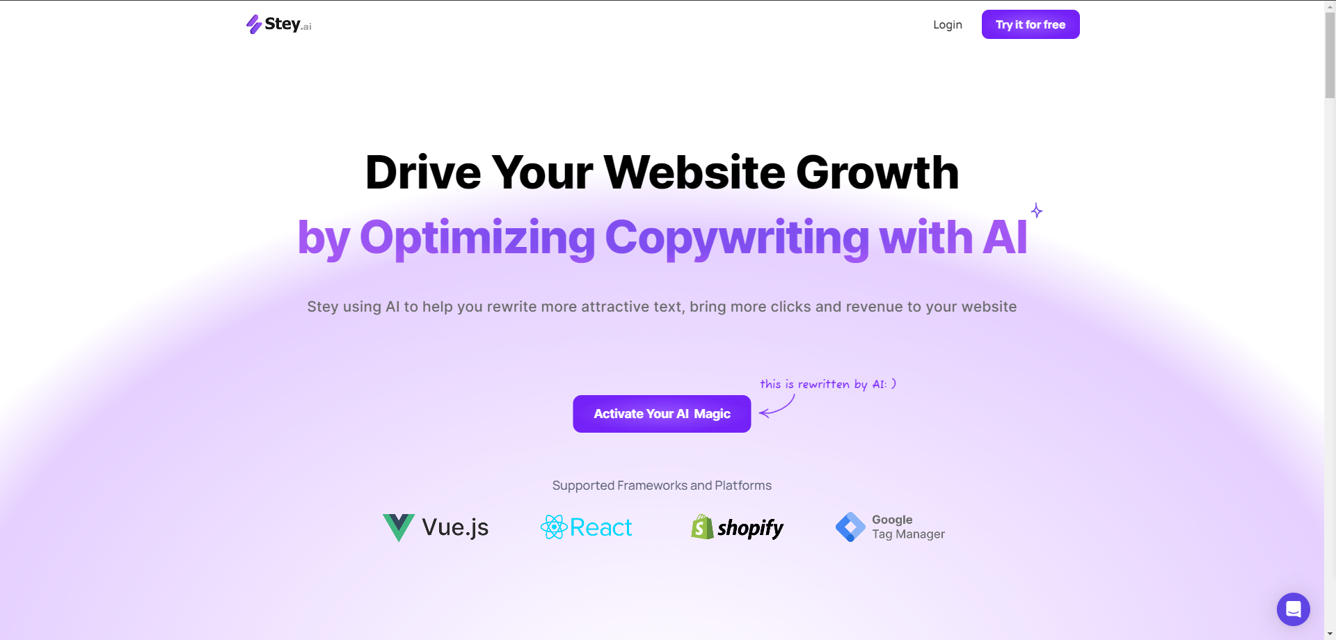 At the core of Stey's offering is a powerful AI engine designed to craft compelling call-to-action buttons and persuasive copy that captures and holds the audience's attention. What makes Stey stand out is its seamless integration with your website's existing design and its ability to deliver personalized content that speaks directly to each visitor. Stey transforms the traditional website into a dynamic, interactive space that actively engages users, guiding them through a customized journey tailored to their interests and needs. It's more than an analytics tool; it's a digital copywriter and designer rolled into one, tirelessly working to optimize every facet of the user experience 📈🖋️.