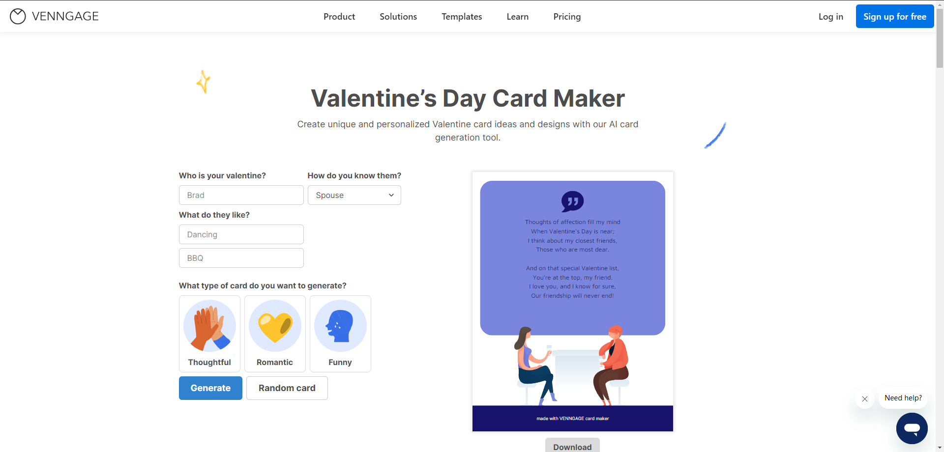Overall, Venngage's Valentine's Day Card Maker stands out for its combination of AI-driven creativity and user-friendly design. It is a perfect tool for anyone looking to express their feelings in a personalized, creative, and thoughtful manner.