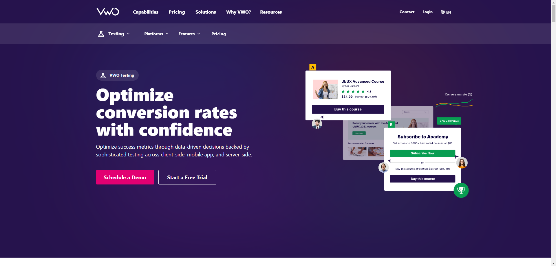 1. Diverse Testing Capabilities: VWO enables powerful A/B, multivariate, and split URL testing. It can handle multi-device and multi-page testing, ensuring a broad and effective optimization strategy.