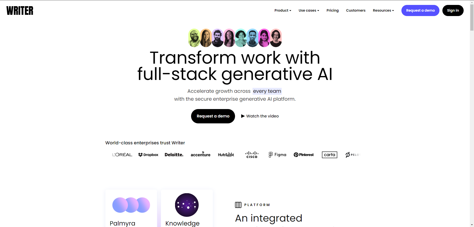 Writer is an "AI writing platform for teams" that helps create clear, consistent, brand-aligned content efficiently, with professional writing guidance and a range of tools for better content management and real-time collaboration.